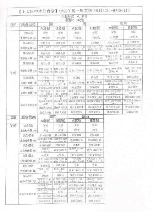 【上大附中本部食堂】学生午餐一周菜谱公示(9月22日-9月26日)