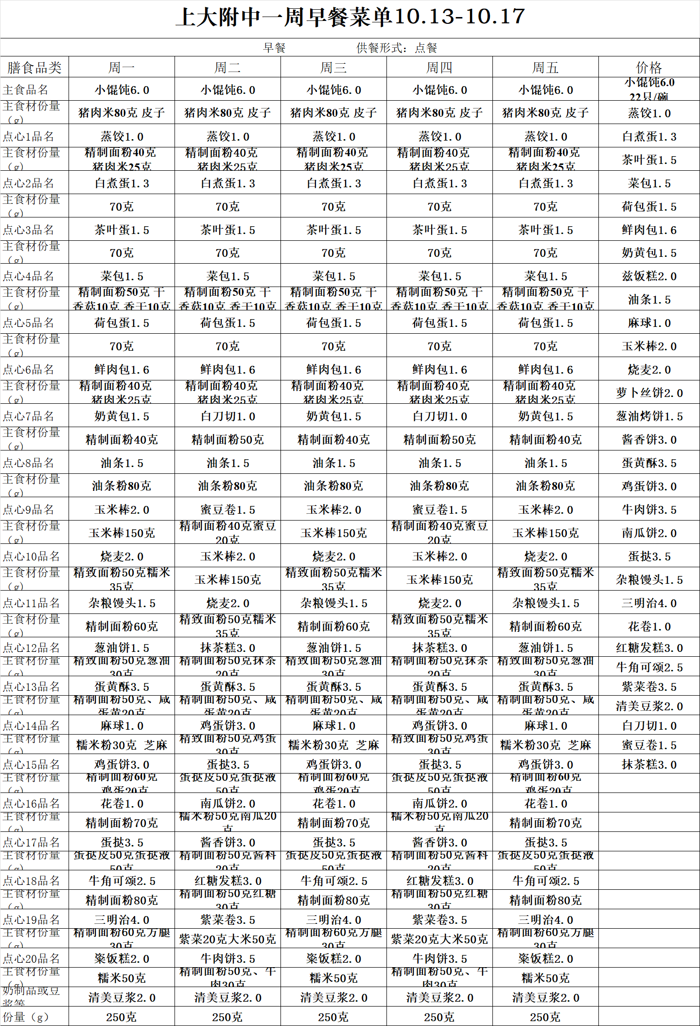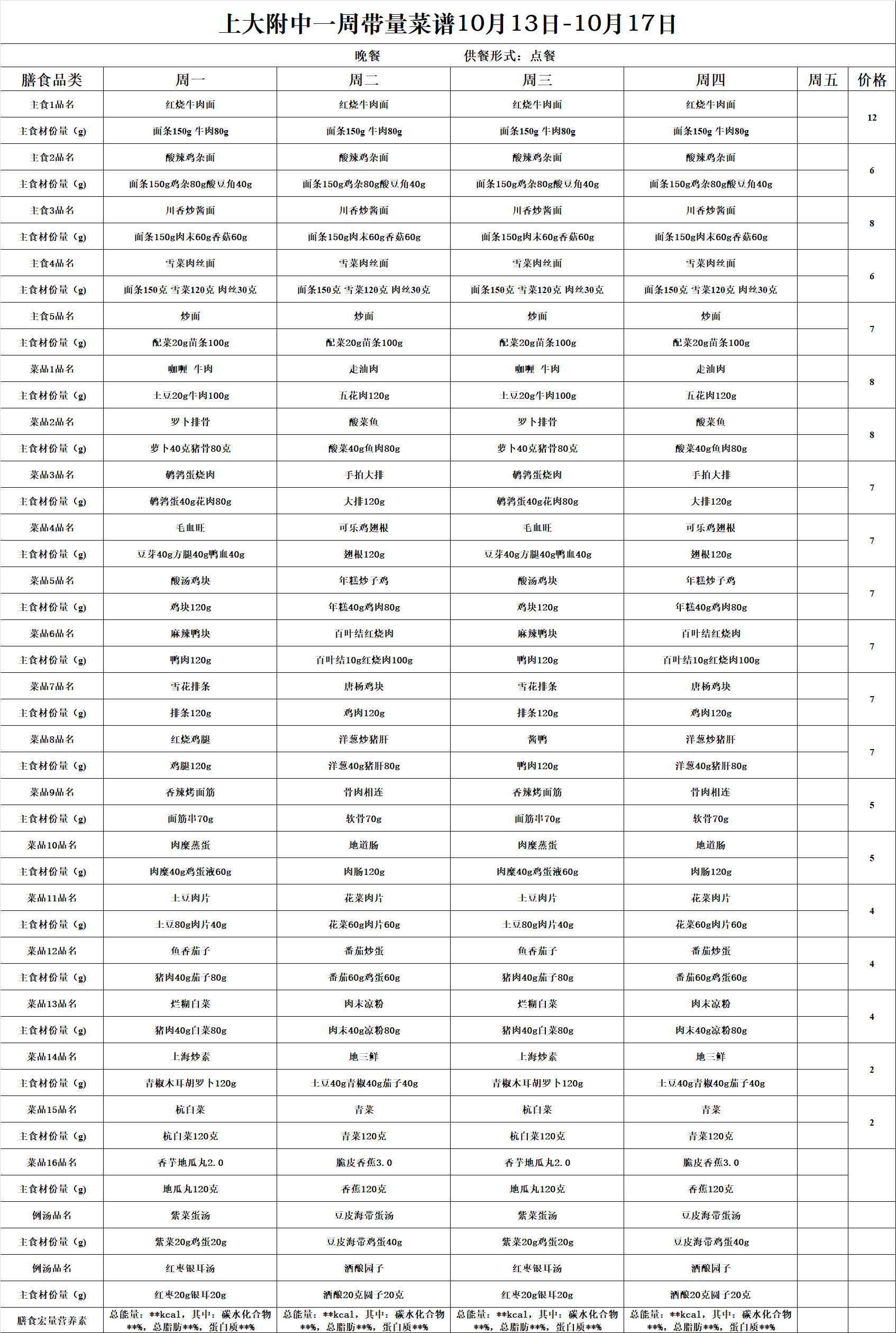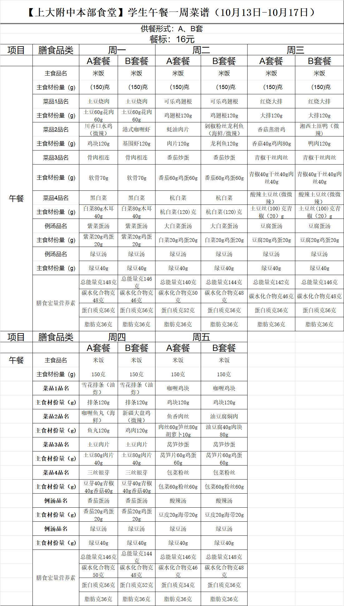 【上大附中本部食堂】学生午餐一周菜谱公示(10月13日-10月17日)