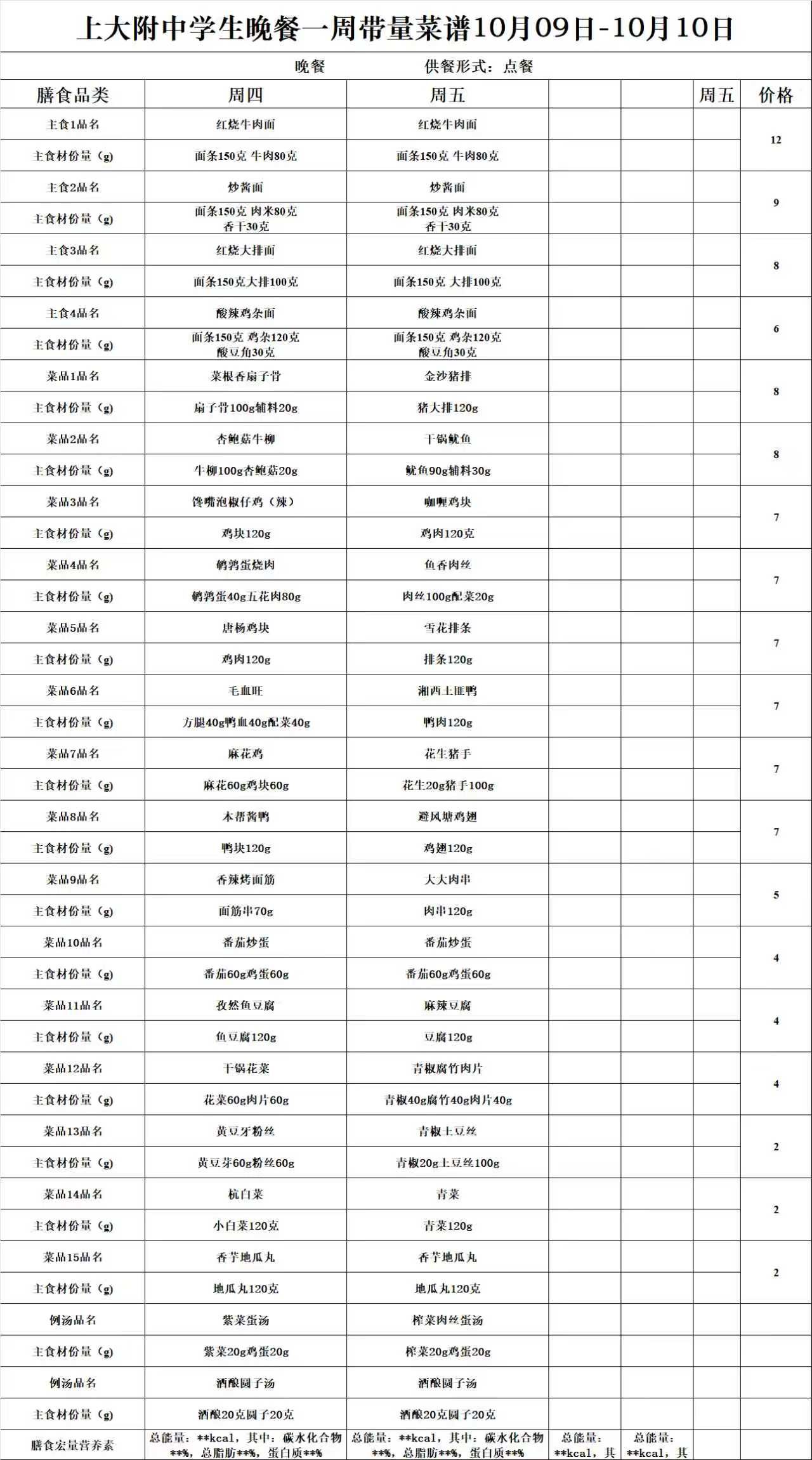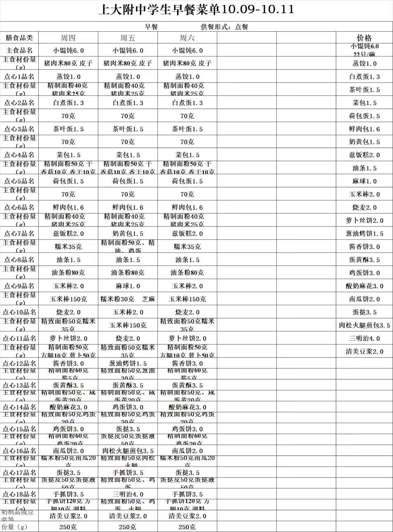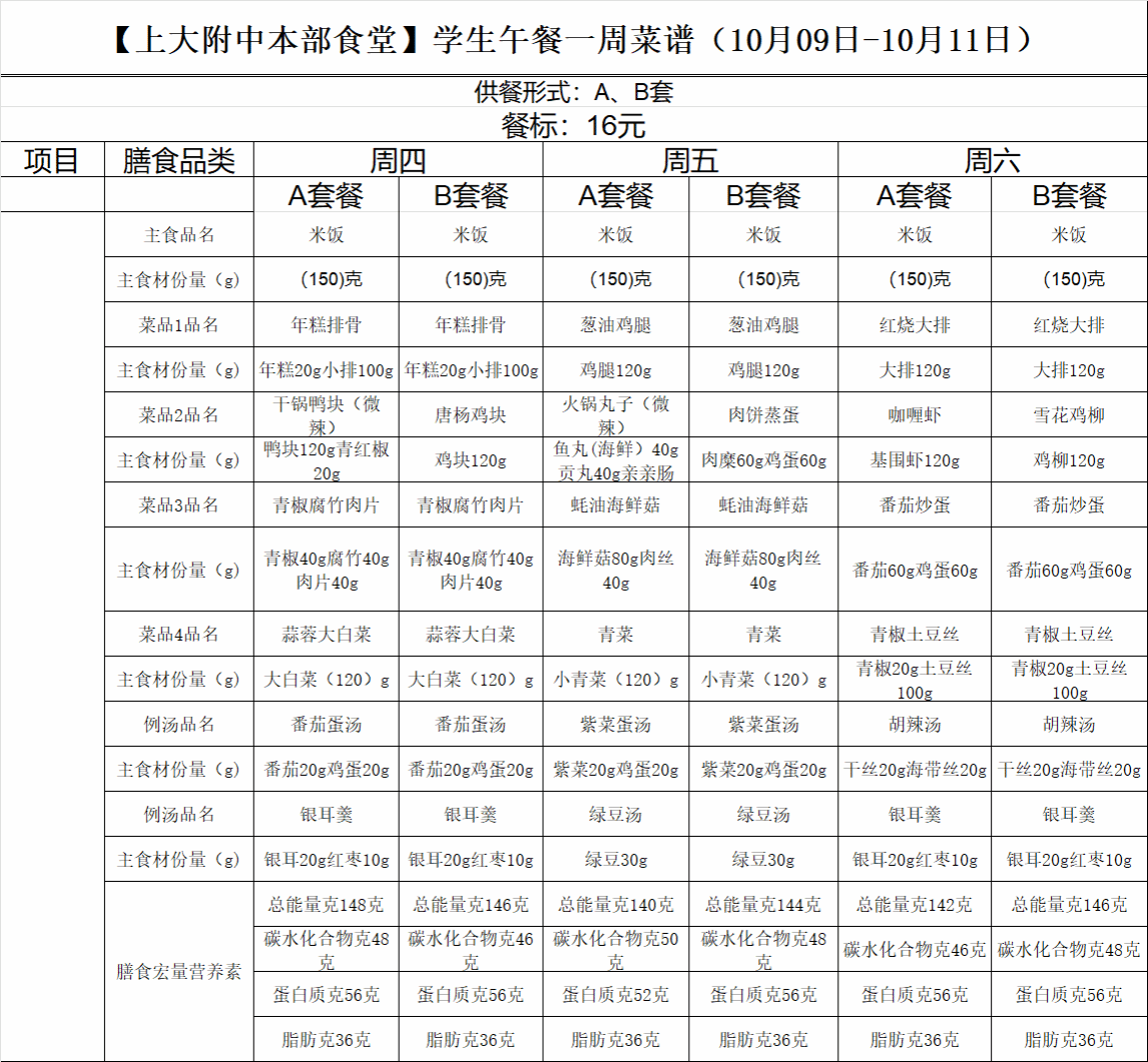 【上大附中本部食堂】学生午餐一周菜谱公示(10月9日-10月11日)