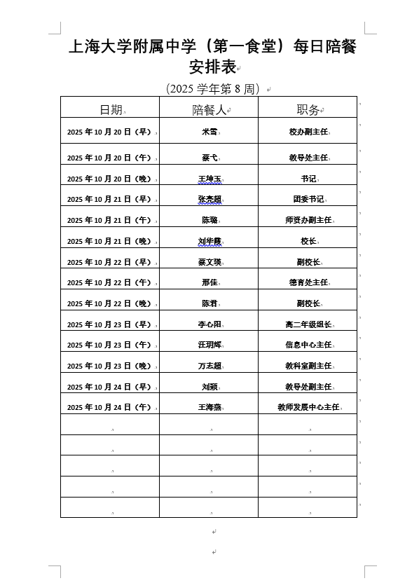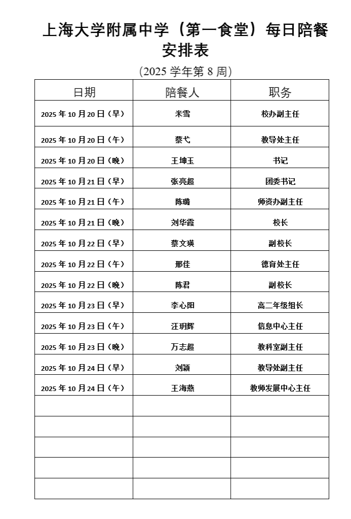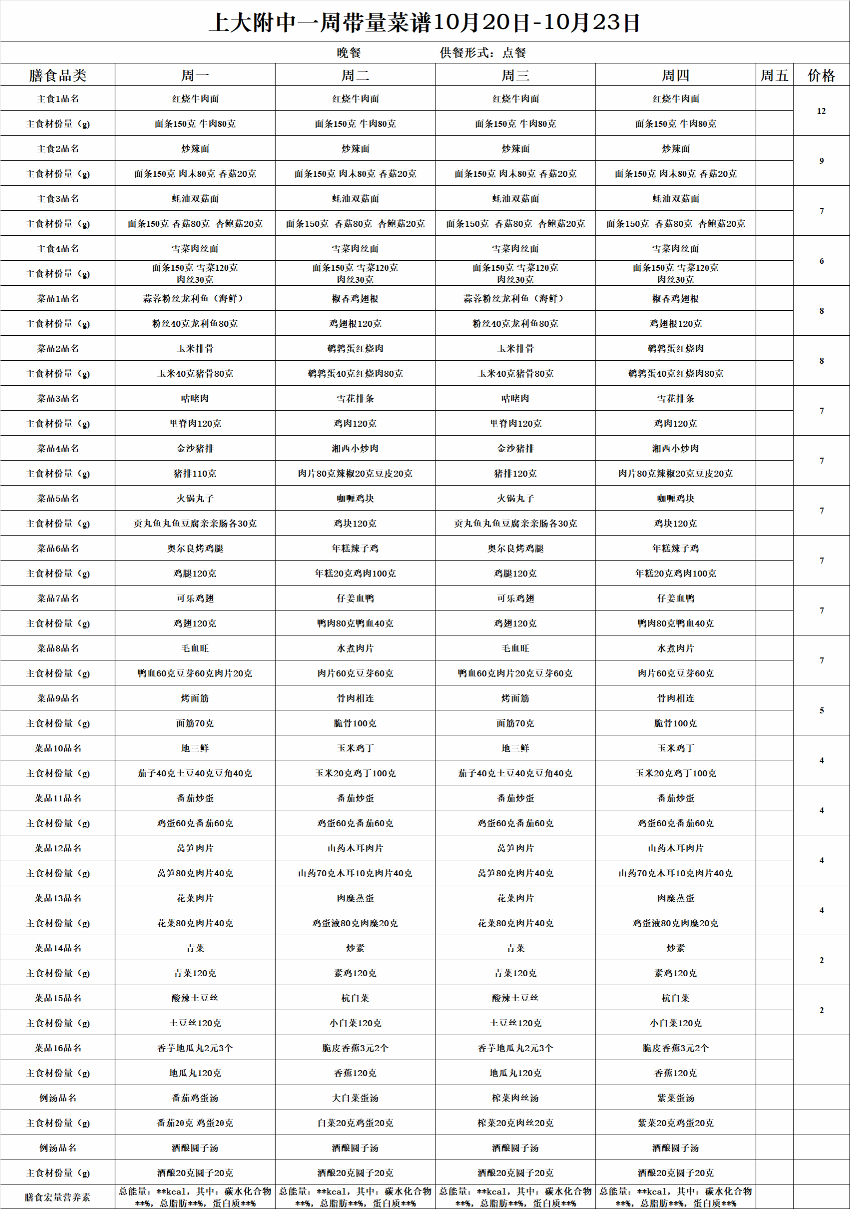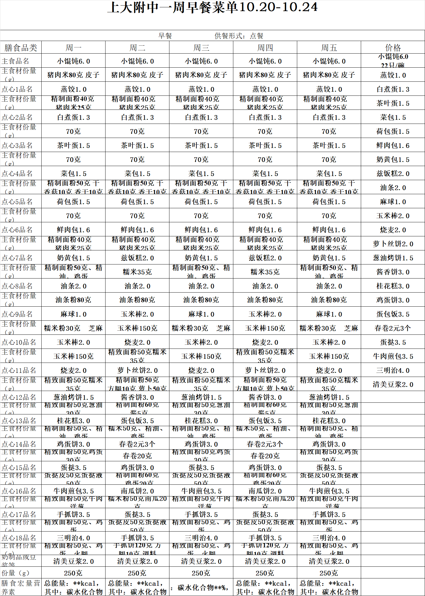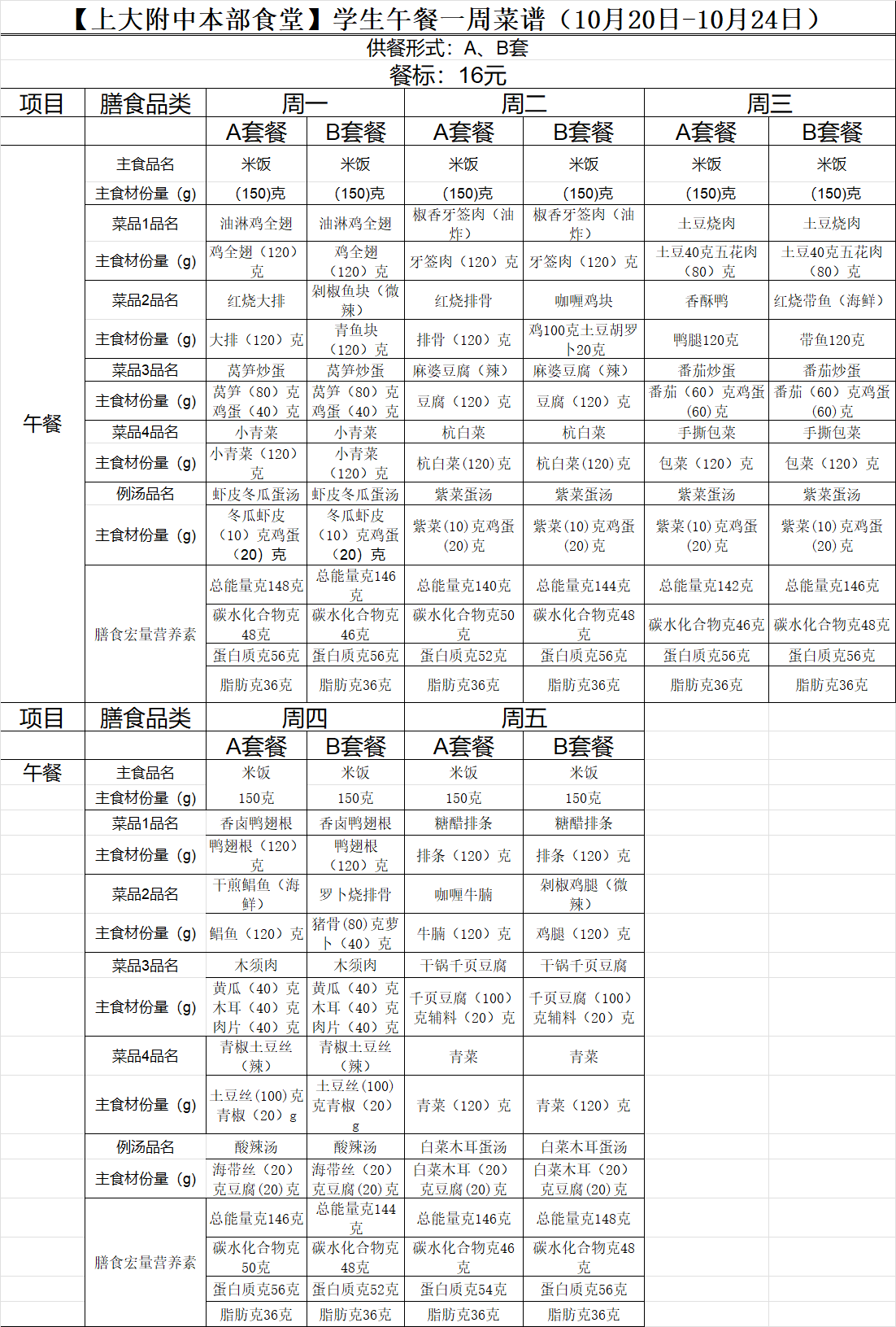 【上大附中本部食堂】学生午餐一周菜谱公示(10月20日-10月17日)