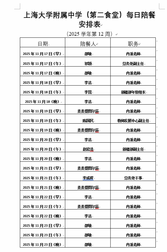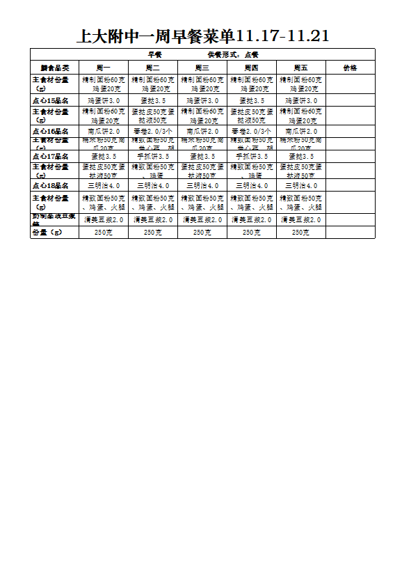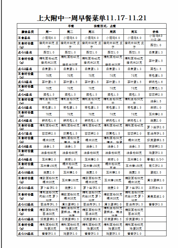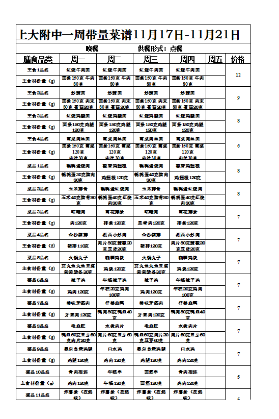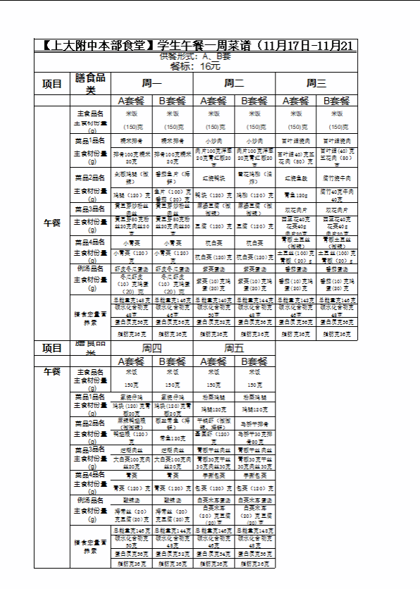 【上大附中本部食堂】学生午餐一周菜谱公示(11月17日-11月21日)