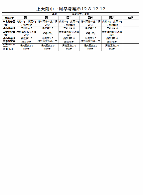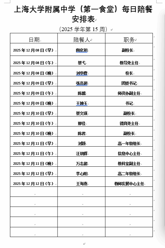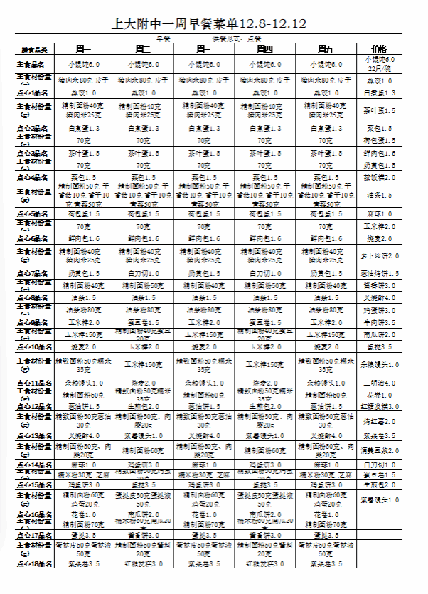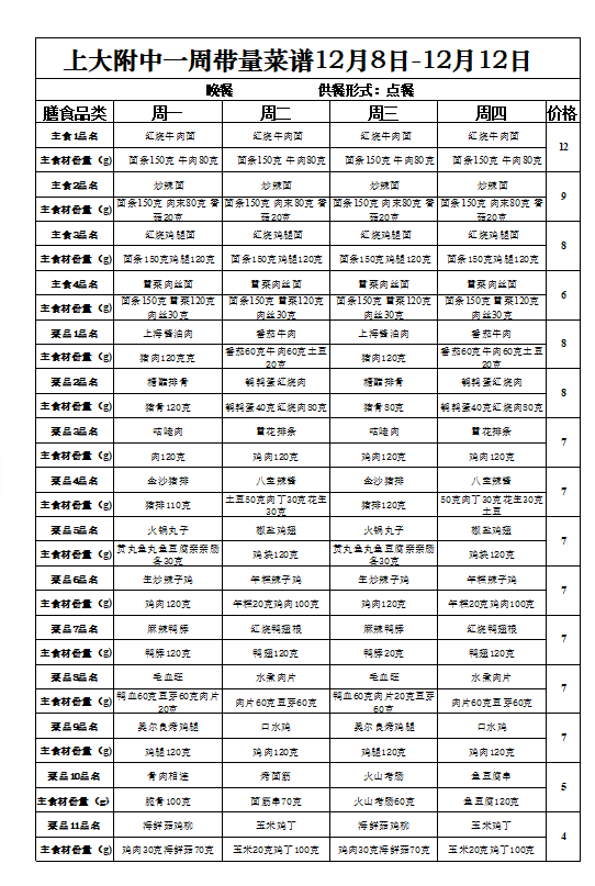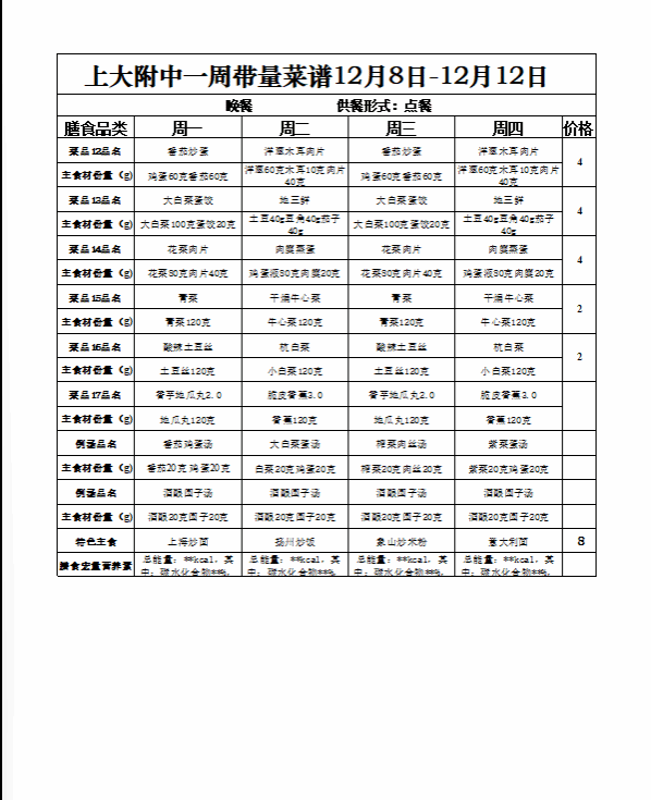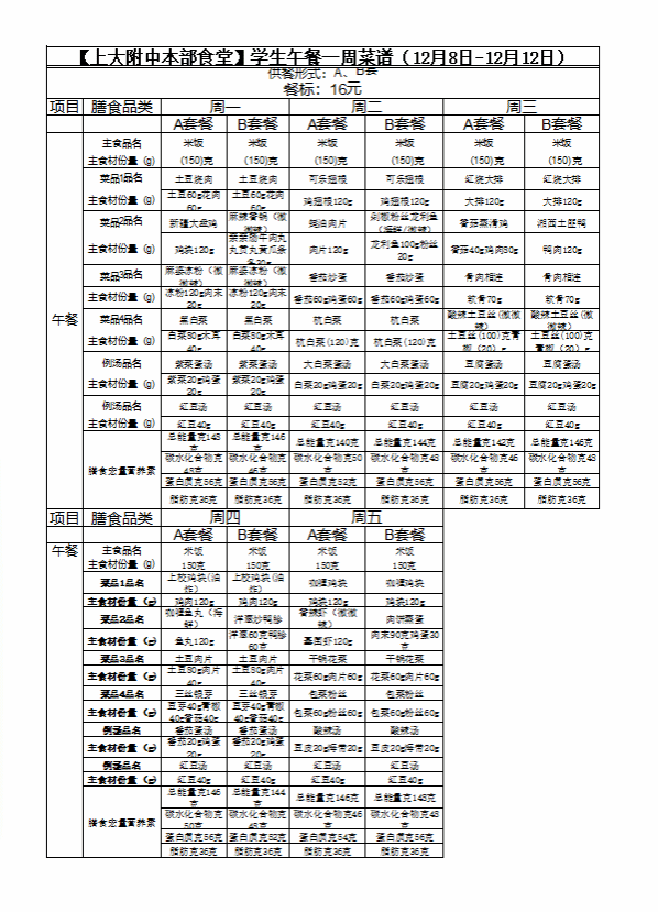 【上大附中本部食堂】学生午餐一周菜谱及陪餐公示(12月08日-12月12日)