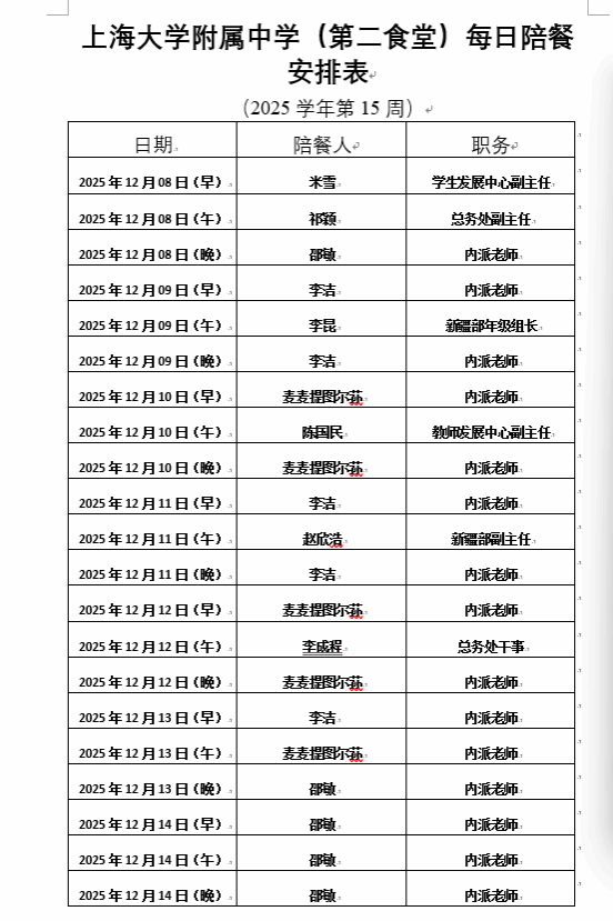 【上大附中本部食堂】学生午餐一周菜谱及陪餐公示(12月15日-12月19日)