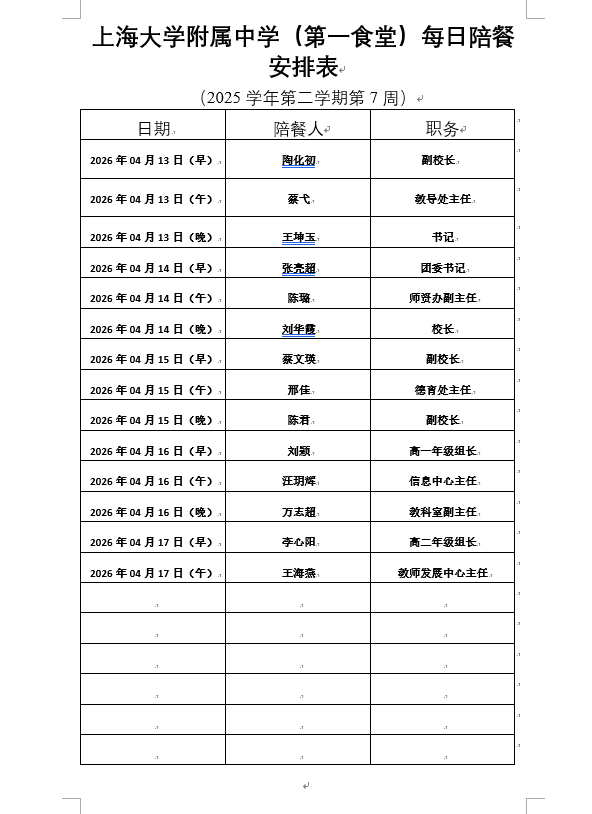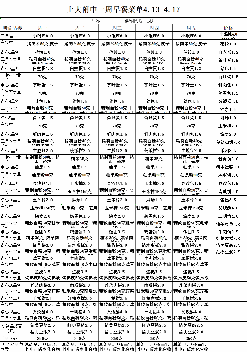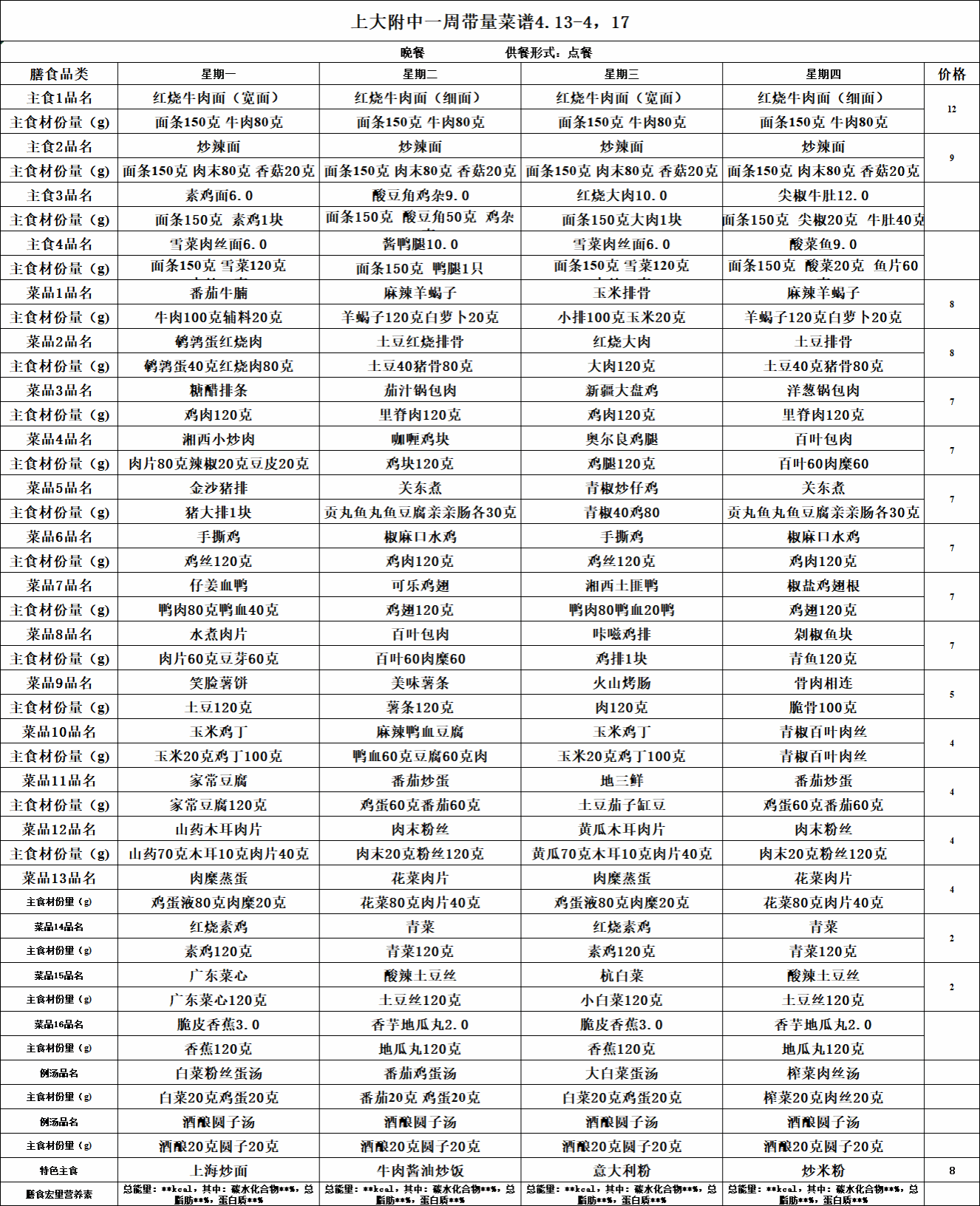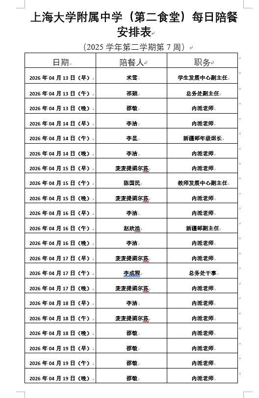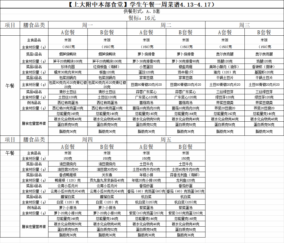 【上大附中本部食堂】学生午餐图片公示(2026年4月13日-2026年4月17日)